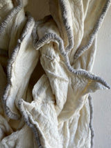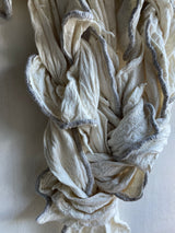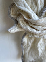 This piece is made from hand cut felted sheets of merino wool which have been hand stitched together to create an oversized yarn. Once arm knitted into shape, this piece was edged with handmade woollen rope in an elegant grey hue.