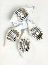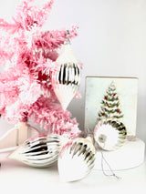 Add a touch of sophisticated sparkle to your Christmas celebrations with this lovely set of four white and silver glass ornaments. Featuring a classic ribbed design that catches and reflects light beautifully, these shiny, bright baubles bring timeless elegance and retro charm to your festive decorating. Perfect for creating a cohesive, sophisticated tree display.
