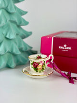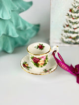 Old Country Roses was designed by Harold Holdcroft and introduced by Royal Albert in 1962. It quickly became a global phenomenon, earning the title of the world's best-selling china pattern. The design features lush pink and red roses with delicate foliage, all framed by 22-carat gold trim. This pattern has graced royal tables, appeared in films, and become synonymous with English elegance and tradition. This miniature tea cup ornament allows you to celebrate this iconic design in a charming, collectible form.