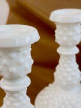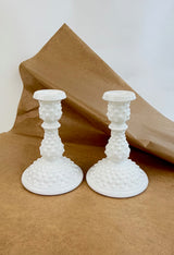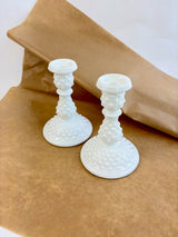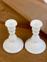 This stunning pair of Fenton Hobnail candlestick holders showcases the artistry of Fenton Art Glass, one of America's most celebrated glass manufacturers. Crafted in luminous milk glass with the iconic hobnail pattern—small, raised, pointy bumps that catch and reflect light beautifully—this pair exemplifies the quality craftsmanship and timeless elegance that made Fenton glass collectible worldwide.