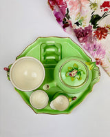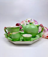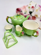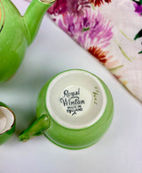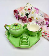 Each piece features the beautiful green-ground Rosebud pattern with hand-painted gold gilt trim and sculptured floral handles that showcase Royal Winton's exceptional craftsmanship. The teapot stands 10cm high, and all pieces nest perfectly on the coordinating octagonal tray for elegant presentation and storage.