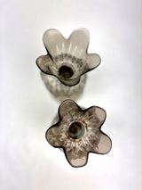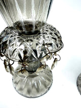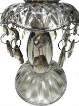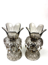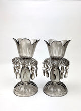 These grey glass candle holders feature cascading crystal drops that catch and refract light beautifully, creating a soft, romantic glow reminiscent of grander eras. The distinctive tulip-shaped tops are designed to hold votive or small pillar candles, making them as functional as they are decorative.