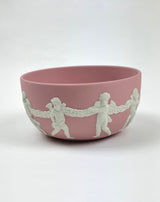 This exquisite Wedgwood Pink Jasperware Bute Bowl showcases the iconic unglazed matte finish and classical relief design that has made Wedgwood a symbol of refined English pottery since 1759. Produced in 1985, this discontinued design features delicate white cherubs holding a garland – a romantic motif perfect for display or as a treasured keepsake holder.
