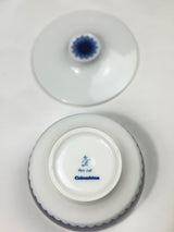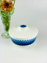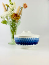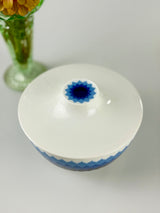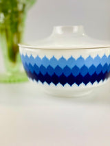 Discover this porcelain lidded dish from the Furstenberg "Colombina" series featuring the iconic blue geometric pattern that defined 1960s German design. Established in 1747, Furstenberg's craftsmanship is legendary, and pieces from the Colombina series are highly collectible worldwide. This lidded dish is not commonly found, making it a special addition for serious collectors, a perfect replacement for a broken piece, an excellent start to your Furstenberg collection, or a stunning statement piece for your mid-century modern home.