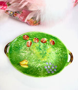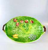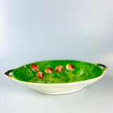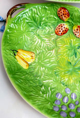 A charming piece of mid-century design, this Japanese majolica-style fruit bowl showcases the vibrant green glaze and naturalistic fruit motifs that made these pieces so collectible. With its embossed relief decoration featuring strawberries, grapes, and leaves, this generous bowl brings vintage character and organic beauty to any table or display.