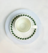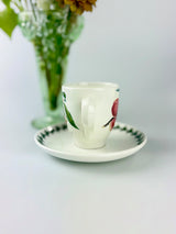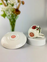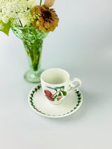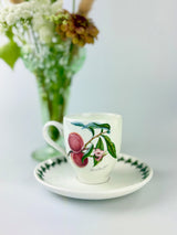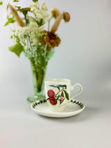 Bring timeless charm to your tea ritual with this Portmeirion Pomona teacup and saucer featuring the "Grimwoods Royal George Peach" motif. This beloved pattern showcases bountiful fruit illustrations taken from 1830s hand-coloured botanical books, creating a distinctive vintage aesthetic that has captivated collectors since the collection launched in 1982. This piece features the original backstamp in orange, indicating it was produced between the mid-1980s and late 1990s. Part of a set of six different fruit illustrations, the Pomona collection is highly collectible and perfect for those seeking classic English tableware with botanical charm. Crafted from earthenware and made in England, this set is designed for everyday use and is both dishwasher and microwave safe.