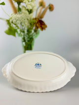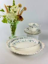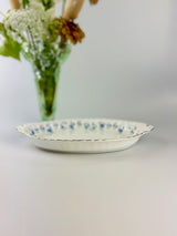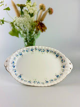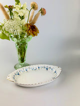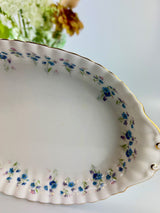 Discover this vintage Royal Albert "Memory Lane" fine bone china serving platter featuring delicate blue forget-me-not flowers and a scalloped edge with 22-carat gold gilding. Memory Lane is highly collectible and sought-after by china enthusiasts and collectors worldwide. This specific piece has the original maker's back-stamp (produced between 1962 and 1972), making it more valuable to collectors. The pattern was discontinued in 2009, adding to its collectible appeal.