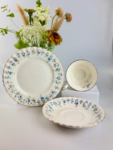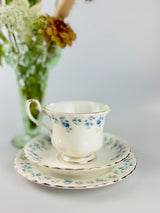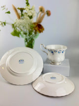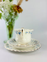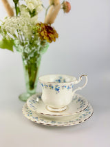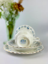 Discover this vintage Royal Albert "Memory Lane" fine bone china teacup trio featuring delicate blue forget-me-not flowers and a scalloped edge with 22-carat gold gilding in the fluted design. Memory Lane is highly collectible and sought-after by china enthusiasts and collectors worldwide. This specific piece has the original maker's back-stamp (produced between 1962 and 1972), making it more valuable to collectors. The pattern was discontinued in 2009, adding to its collectible appeal.