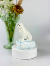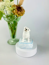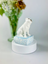 Bring delightful character to your home with this Royal Doulton "Lucky" pug figurine from the beloved Top Dog Series. This hand-decorated fine bone china piece depicts an adorable white pug seated contentedly on a blue and white chevron patterned cushion, capturing the breed's endearing personality with expert craftsmanship. Numbered TD004, Lucky is one of six dogs in the complete Top Dog Series, first issued in 2016 and now discontinued, making it increasingly sought-after by collectors. Royal Doulton is renowned worldwide for its extensive range of ceramic figurines, and this charming pug exemplifies their commitment to quality and artistry. Perfect for pug lovers, Royal Doulton collectors, or anyone seeking a whimsical accent piece with timeless appeal.