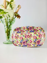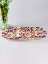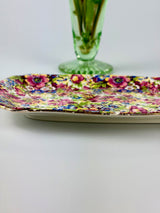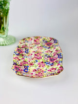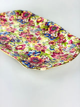 Brighten your table with this stunning Royal Winton Sunshine chintz serving plate. Featuring the iconic all-over floral pattern in vibrant yellows, oranges, and greens with gold-gilded edges, this piece showcases the bold colors and intricate designs that make Royal Winton's chintz patterns so sought-after by collectors. Perfect for displaying, this plate brings vintage glamour and cheerful charm to your home.