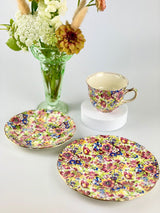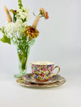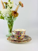 Brighten your afternoon tea with this stunning Royal Winton Sunshine chintz trio. Featuring the iconic all-over floral pattern in vibrant yellows, oranges, and greens with gold gilded edges, this complete set showcases the bold colours and intricate designs that make Royal Winton's chintz patterns so sought-after by collectors. Perfect for display, this trio brings vintage glamour and cheerful cottage core charm to your home.