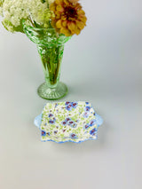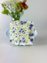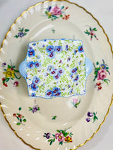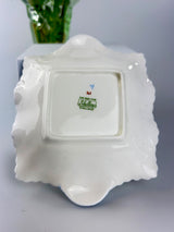Discover this sweet pin or trinket dish made from fine bone china by Shelley in the iconic "Dainty" shape. Featuring a scalloped, blue-trimmed edge and two small handles, this piece is marked with the number 21 on the back—a decorator's mark (also known as a paintress's mark) that enabled Shelley to identify the specific artisan who worked on the piece. A highly collectible and sought-after treasure by enthusiasts of vintage British bone china.