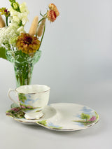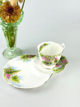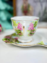 Bring the beauty of the English countryside to your tea time with this Royal Albert "The Old Mill" vintage fine bone china teacup and tennis plate set. It features a vibrant country cottage setting with blossoming trees and silver birch trees depicted on both the cup and the tennis plate. The cup and plate have gold gilt rims, and the shape of the cup is called "Countess." This is a unique design and highly collectible.