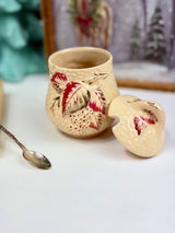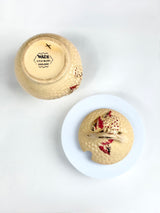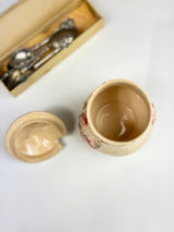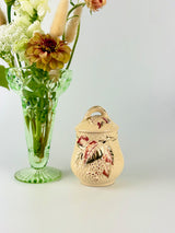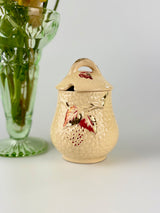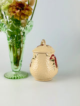 Bring mid-century English charm to your table with this delightful piece from Wade, England, which can be used as either a jam jar or sugar bowl. The Bramble pattern features an embossed hand-painted bramble berry design with a soft cream glaze, gold gilding, and red enamel highlights. This specific line with the metallic accents was called "Gold Blush" and is very popular amongst collectors who appreciate a cottage core style.